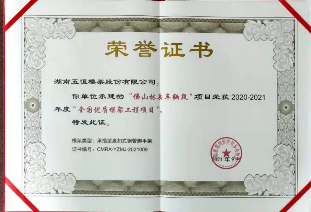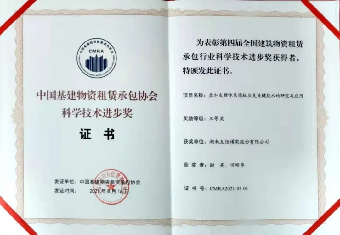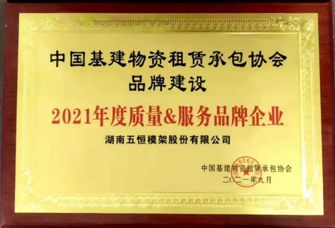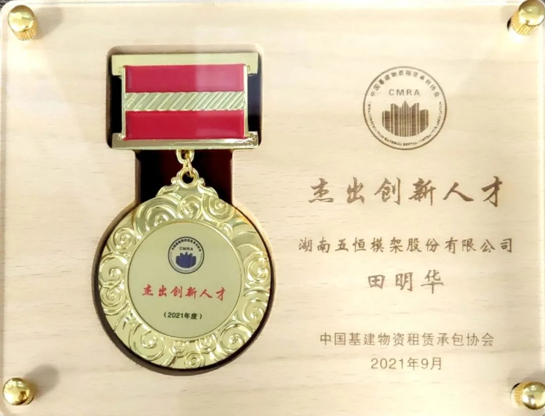 在本次會議中,湖南五恒模架股份有限公司榮獲第四屆全國建筑物資租賃承包行業科學技術進步獎、由公司承建的“佛山林岳車輛段項目”榮獲全國優質模架工程項目、并被授予2021年度質量與服務品牌企業。同時我司總工程師田明華同志被授予2021年度杰出創新人才獎!