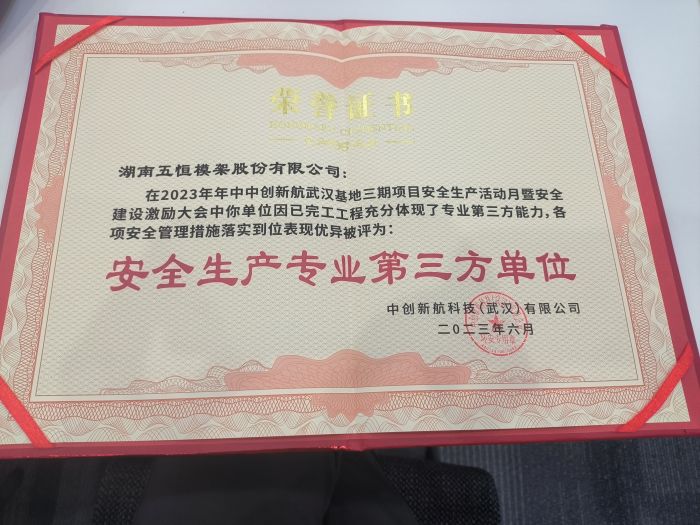 近日,公司在武漢中創新航三期項目安全建設激勵大會上被中創新航業主評選為優秀“安全生產第三方單位”,對五恒模架在項目安全質量等各方面的優異表現給予高度認可。中建八局及中建二局在該項目三期的盤扣支架專業分包均由五恒模架承接完成。